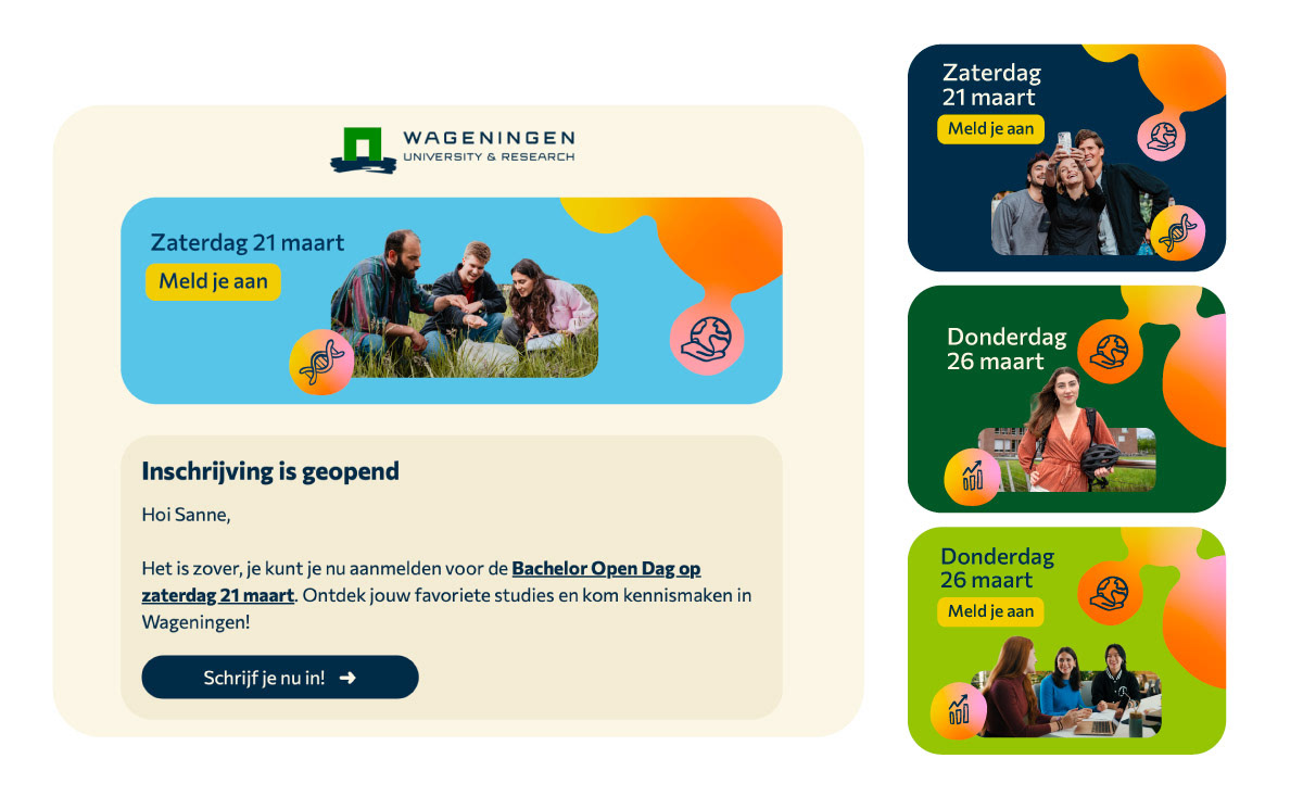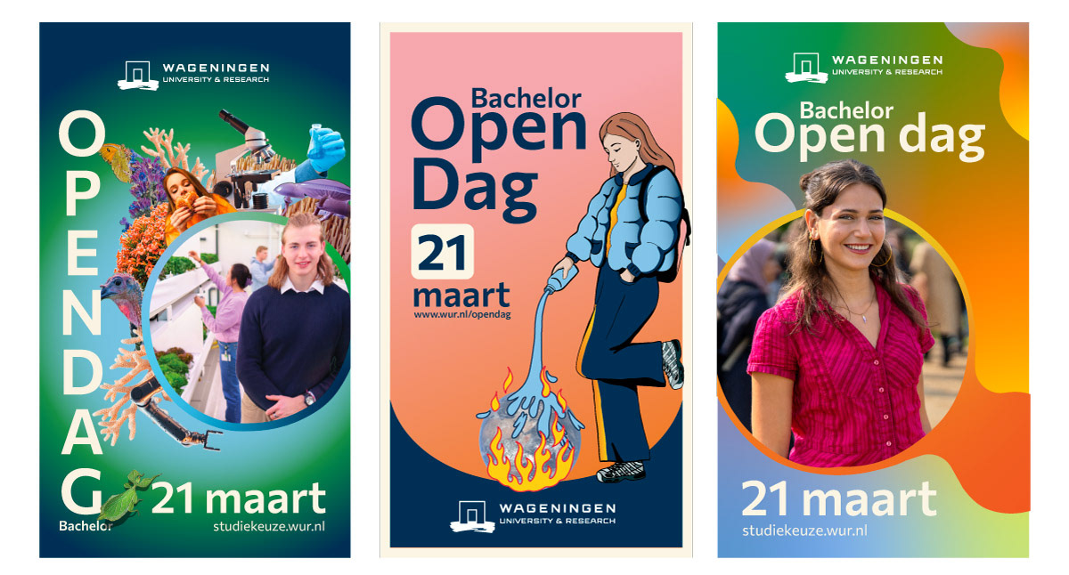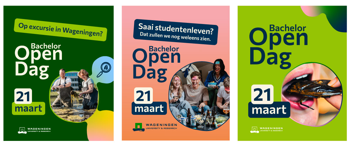 Voor Wageningen University & Research mocht ik aan de slag met een nieuwe huisstijl, speciaal gericht op studiekiezers. De bestaande stijl voelde net iets te braaf en algemeen om deze doelgroep echt te raken. Tijd voor iets anders dus.